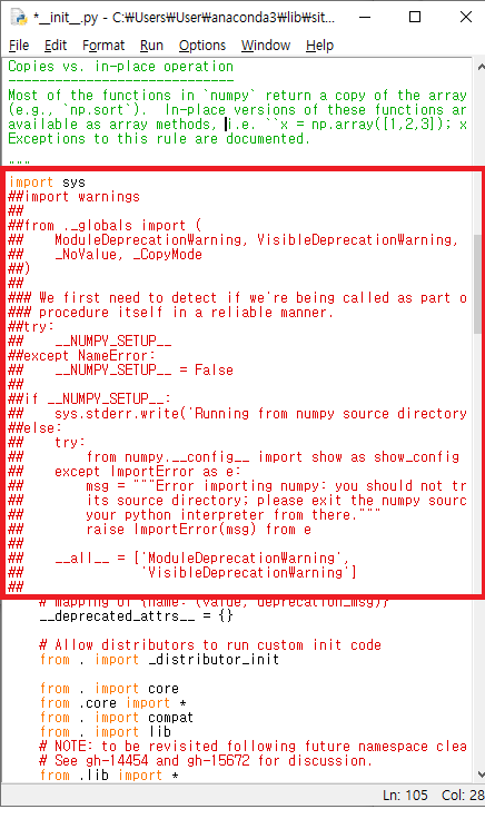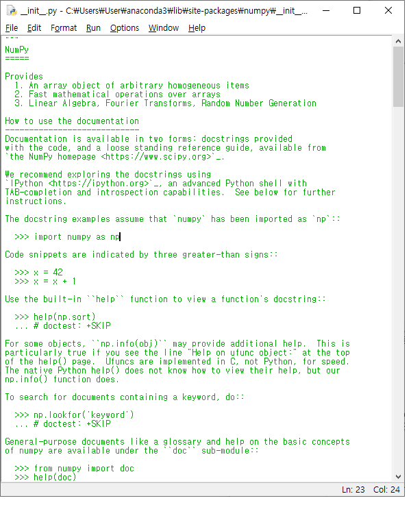 Alt + M : 모듈 열기 -- numpy 모듈열기를 하면 아래와같이 numpy 구현에 대한 내용이 나옵니다.