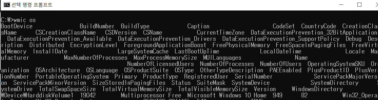 2. wmic [클래스네임] 입력후 엔터예를 들어, os에 대한 정보를 확인하려면 아래와 같이 입력하면 됩니다.
