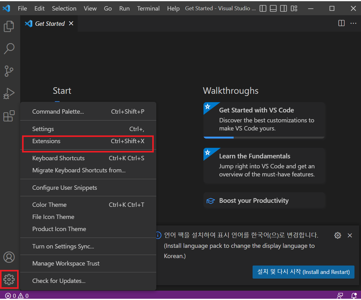 2) visual studio code의 좌측 하단에 톱니바퀴를 클릭후 Extensions를 눌러줍니다.