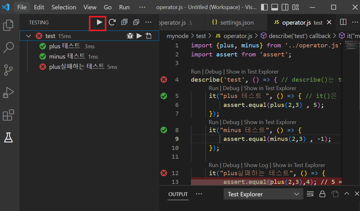 I would like to introduce mocha, a representative java/type script test framework in vscode. The final version is as shown below. I would like to see a screen where you can check the execution r