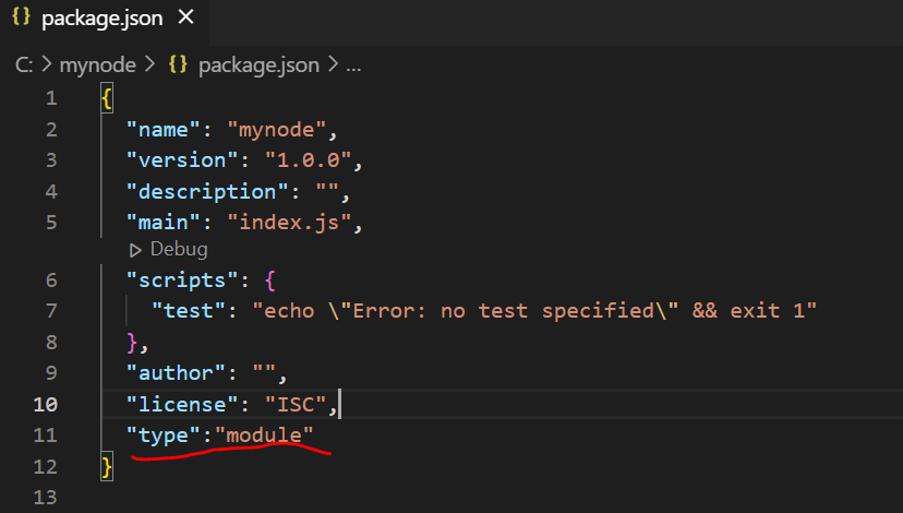 추가적으로 텍스트에디터를 열어 "type":"module" 을 추가해줍니다.