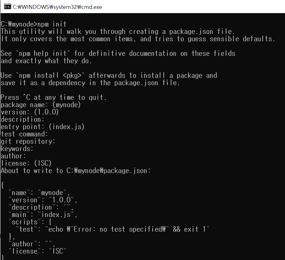 그러면, C:\mynode\package.json 파일이 만들어지는데요,