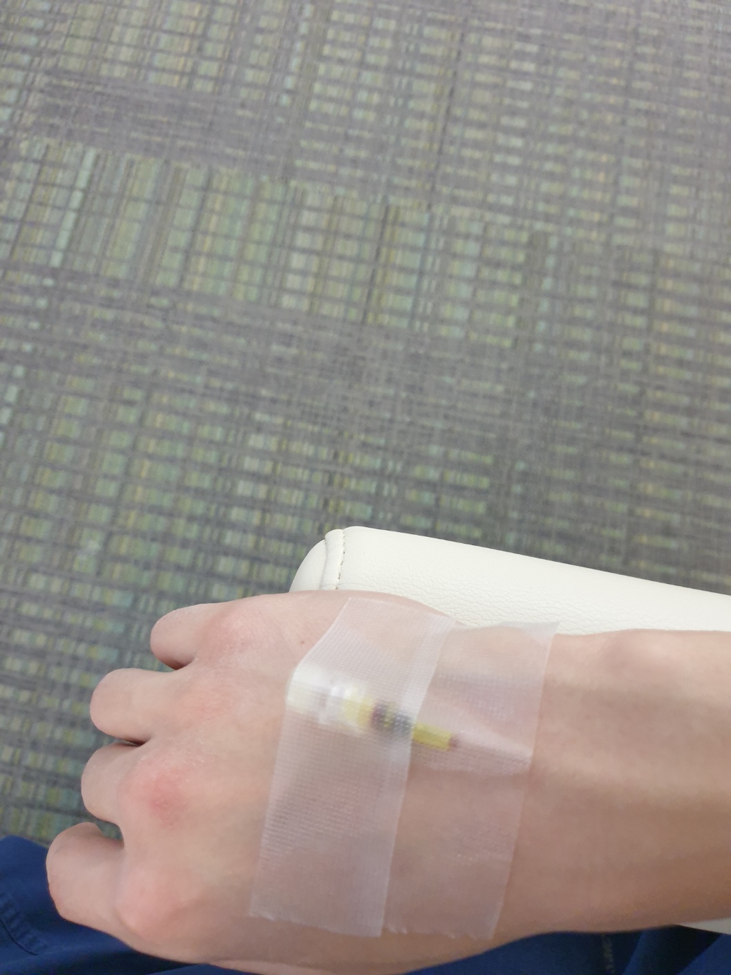 그리고 내시경에 대해 대기를 하고 접수를 하면 수면내시경을 위해 아래와 같이 손등에 주사바늘을 꽂아 줍니다.