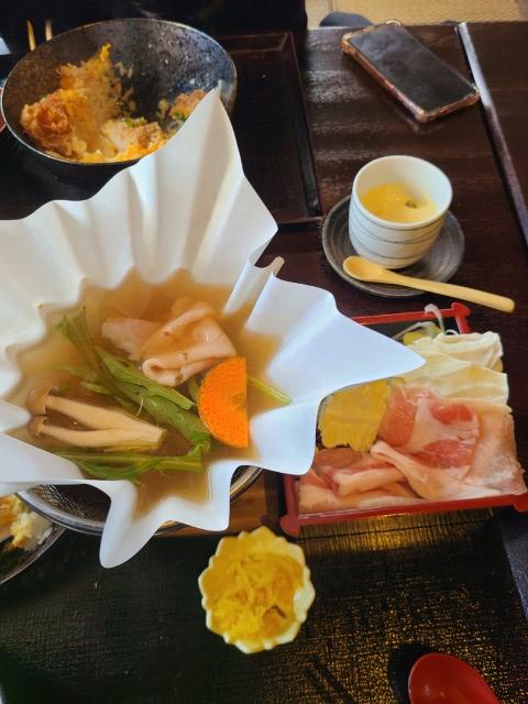 종이에 국물이 담겨서 나오는데, 거기에 야채와 고기를 익혀서 먹습니다.