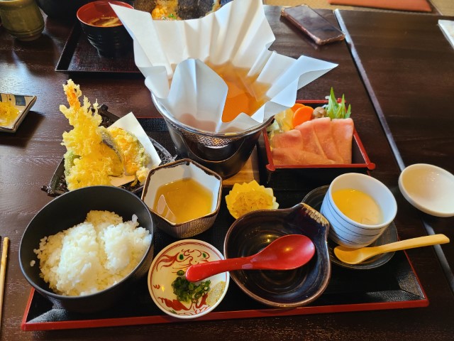 밥, 국, 계란찜 ,튀김이 나왔습니다.