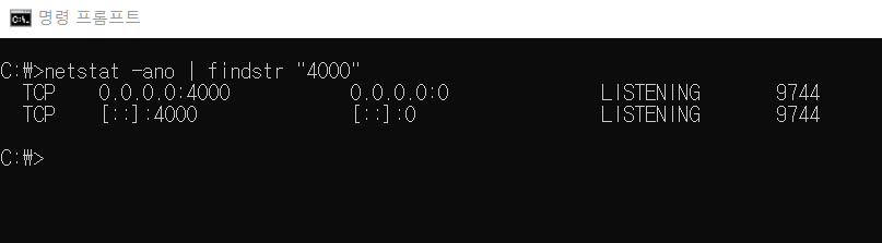참고로, findstr은 netstat -ano의 출력결과중에서 특정한 글씨를 찾는 명령어입니다.
