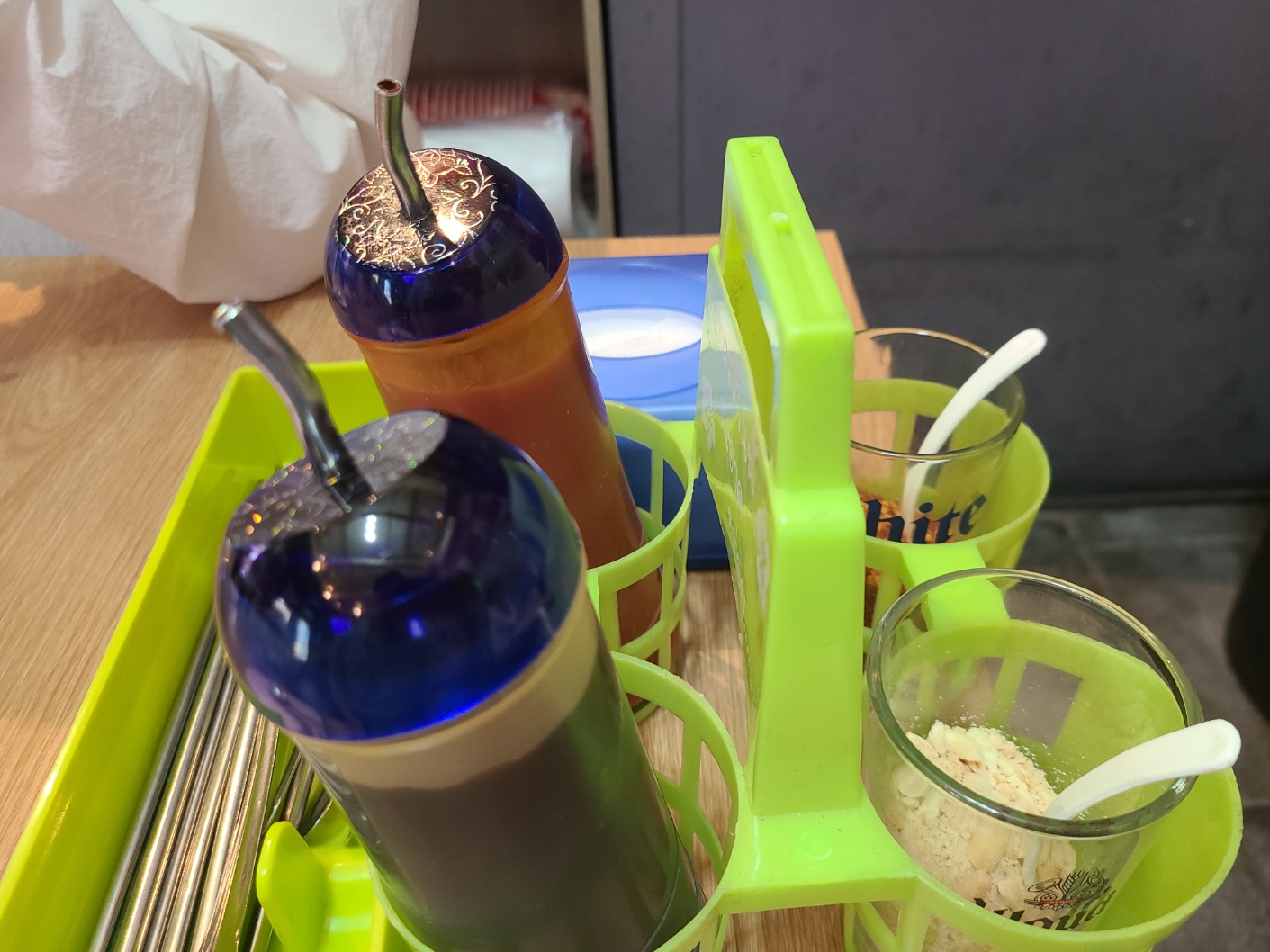 양념으로 칠리, 데리야끼소스, 페퍼, 땅콩가루가 있습니다.