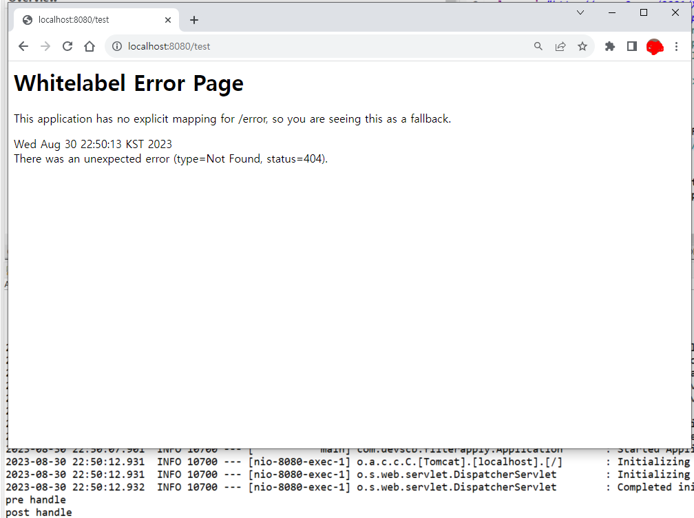 /test 를 브라우저에서 접근을 하면 콘솔창에 아래와 같은 결과가 나오게 됩니다.