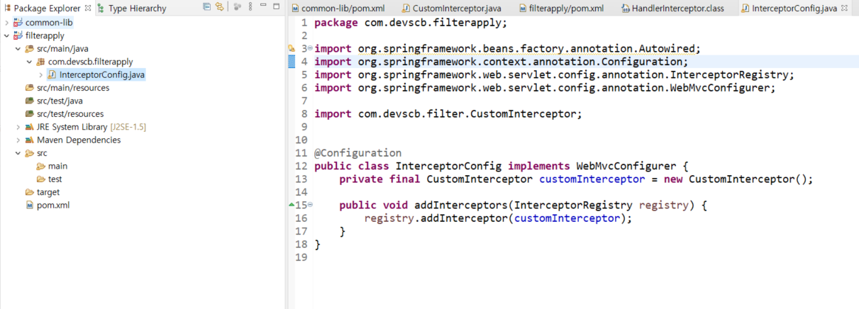 4. InterceptorConfig 클래스를 만들어, 아래와 같이 작성해줍니다.