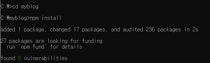 2) cmd창에 아래 명령어를 입력하여 실행하면 hexo가 설치완료됩니다.
