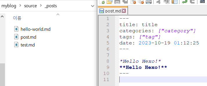 그러면 블로그경로/source/_posts/에 [title].md 라는 파일이 만들어지는데요, 이 파일에 내용을 아래와 같이 작성하면 됩니다.