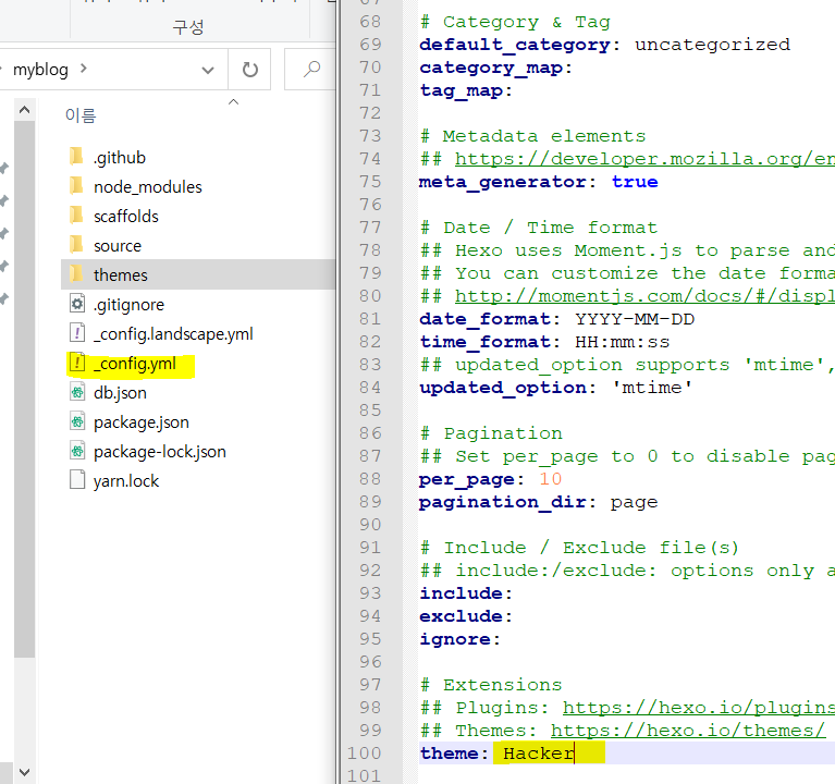 3. 다운이 완료되었으면, 블로그가 설치된 _config.yml의 theme 부분에 theme 폴더 이름을 써 줍니다.