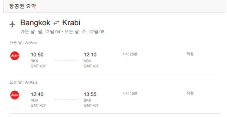 | 항공권예매 - 국내선 | 방콕 <-> 끄라비 항공권 예매 필요 |