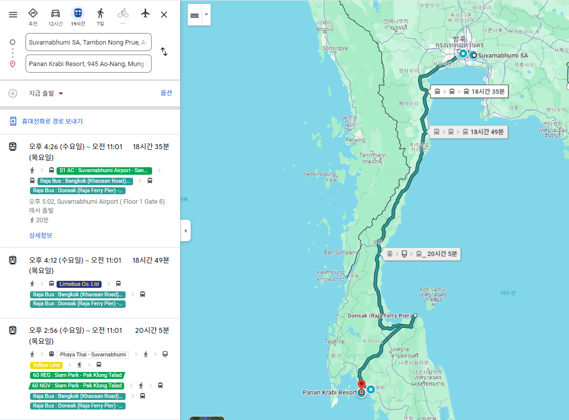 방콕에서 끄라비로 가는 법은 버스로도 갈 수 있긴 하지만, 아래와 같이 무지막지하게 많은 시간이 소요됩니다.