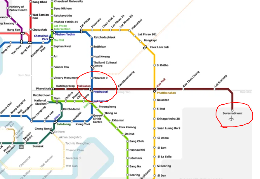 아래는 방콕 도시철도 노선표에서 숙소가 위치한 펫차부리역(중앙)과 수완나품공항(우측) 을 표시하였는데요,