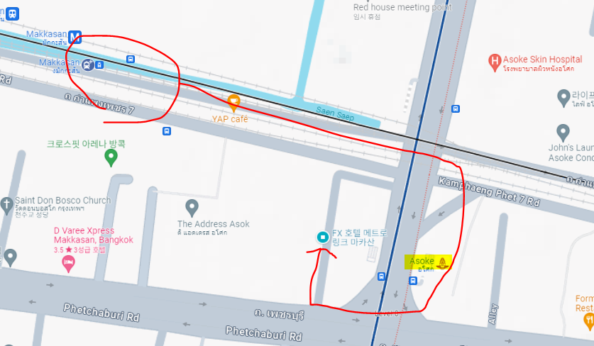 공항철도 Makkasan역의 출구가 아래 형광색으로 표시된 곳에 있어서,