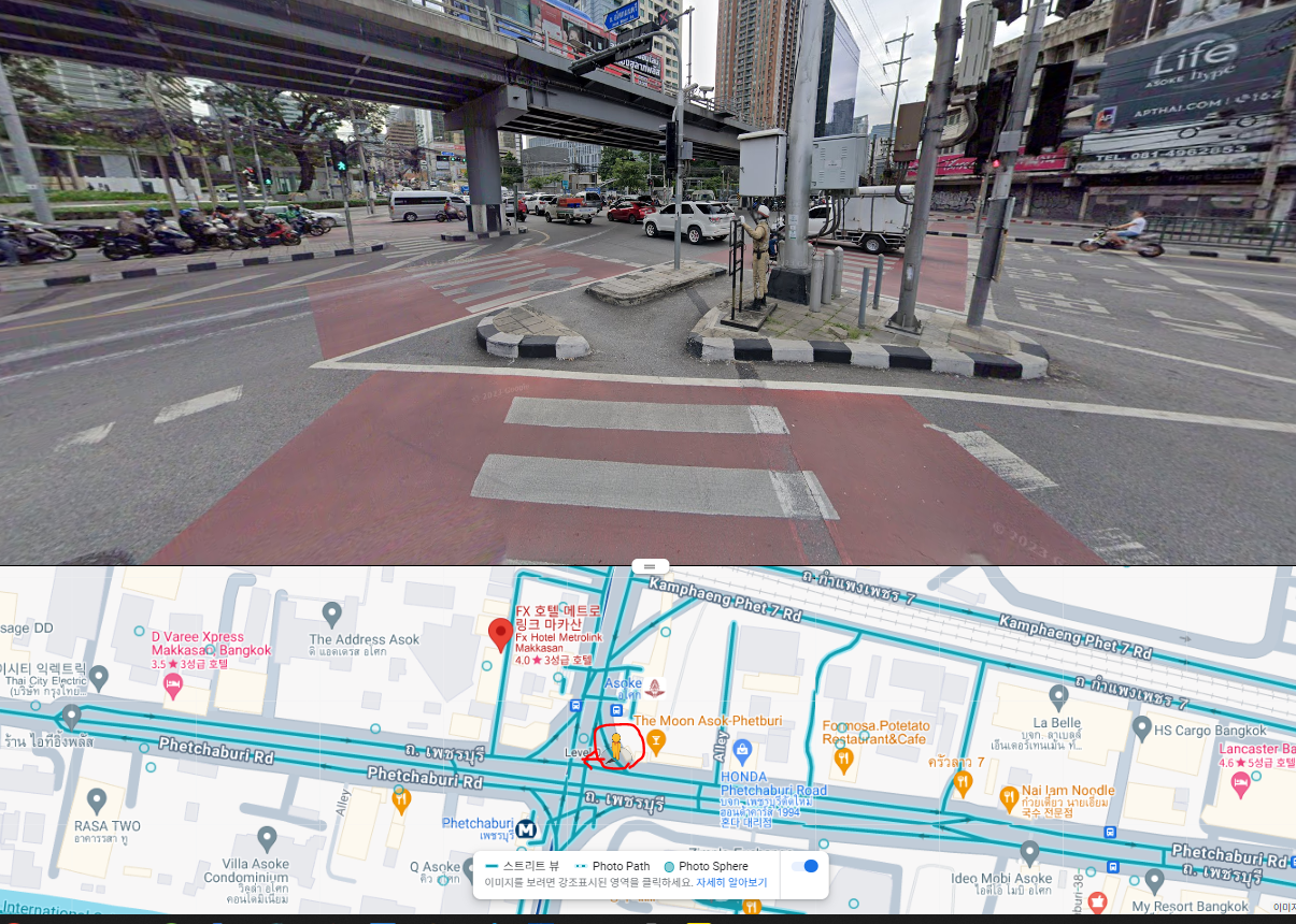 길건너는곳에서의 구글 스트릿뷰와 지도로 표시하면 아래와 같습니다.