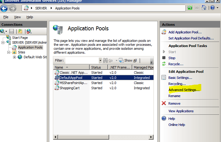 1) IIS에서 application pool을 선택합니다.