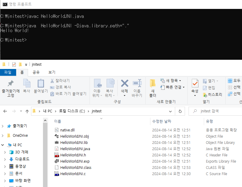 {visual studio 설치 경로}\VC\Tools\MSVC\14.40.33807\bin\Hostx64\x64\cl /LD /EHsc /I "%JAVA_HOME%\include" /I "%JAVA_HOME%\include\win32" HelloWorldJNI.c