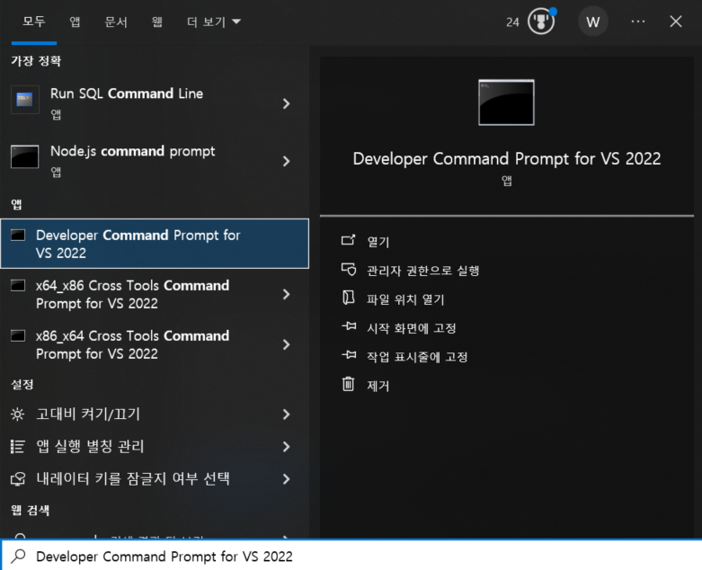 만일 developer command prompt for vs를 못 찾으실 경우 커맨드창으로 들어가신 후, 아래와 같은 명령어로 실행하시면 됩니다.