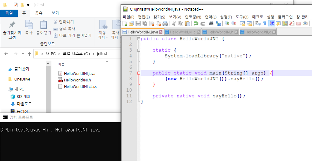 HelloWorldJNI.java 파일을 작성한 뒤, 커맨드창에 아래와 같이 입력해줍니다.