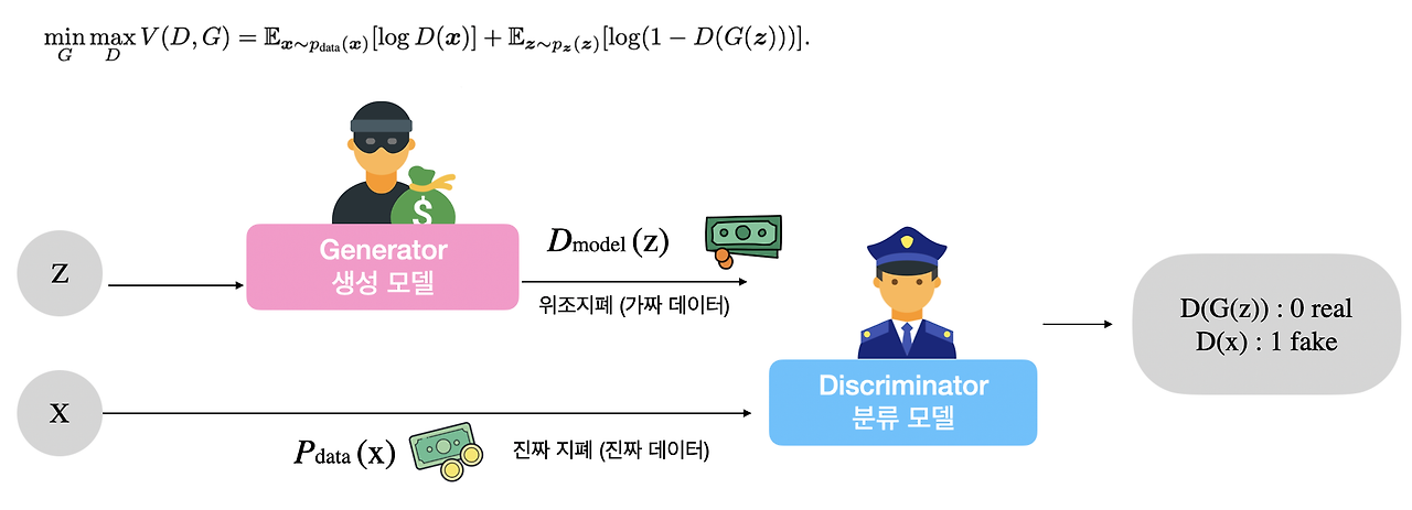 - Generator는 Discriminator를 속이도록 학습