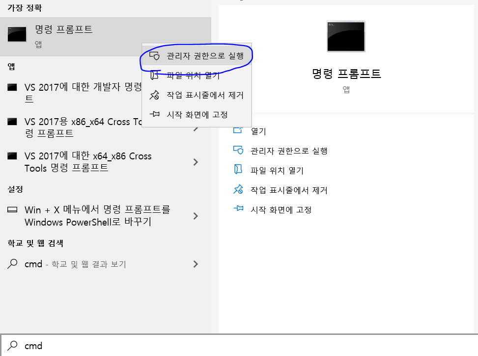 혹시 아래와 같은 에러가 발생할경우, 관리자모드로 커맨드창을 실행해주세요!