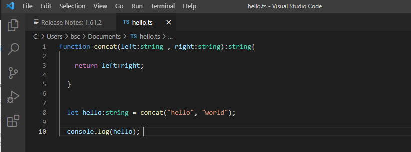 let hello:string = concat("hello", "world");console.log(hello);