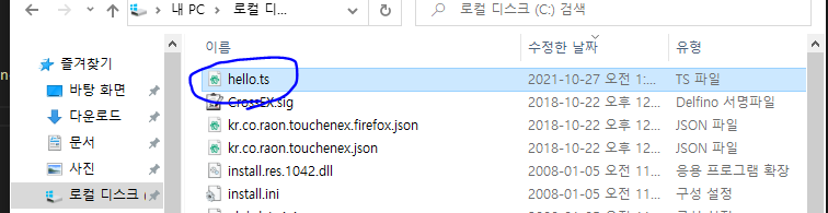 상단 메뉴의 File > Save 를 눌러 C:\에 hello.ts 로 저장해줍니다.