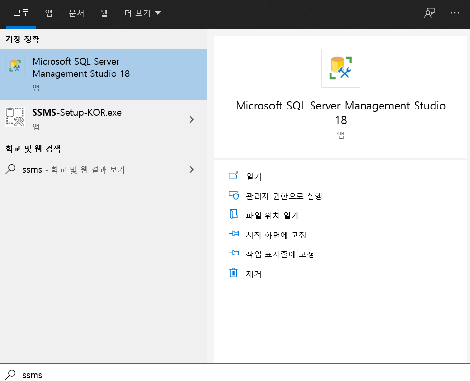 3) 설치가 완료된 후, 바탕화면에서 윈도키를 눌러 검색에서 SSMS 를 치면 아래와 같이 Microsoft SQL Server Management Studio 가 검색됩니다.