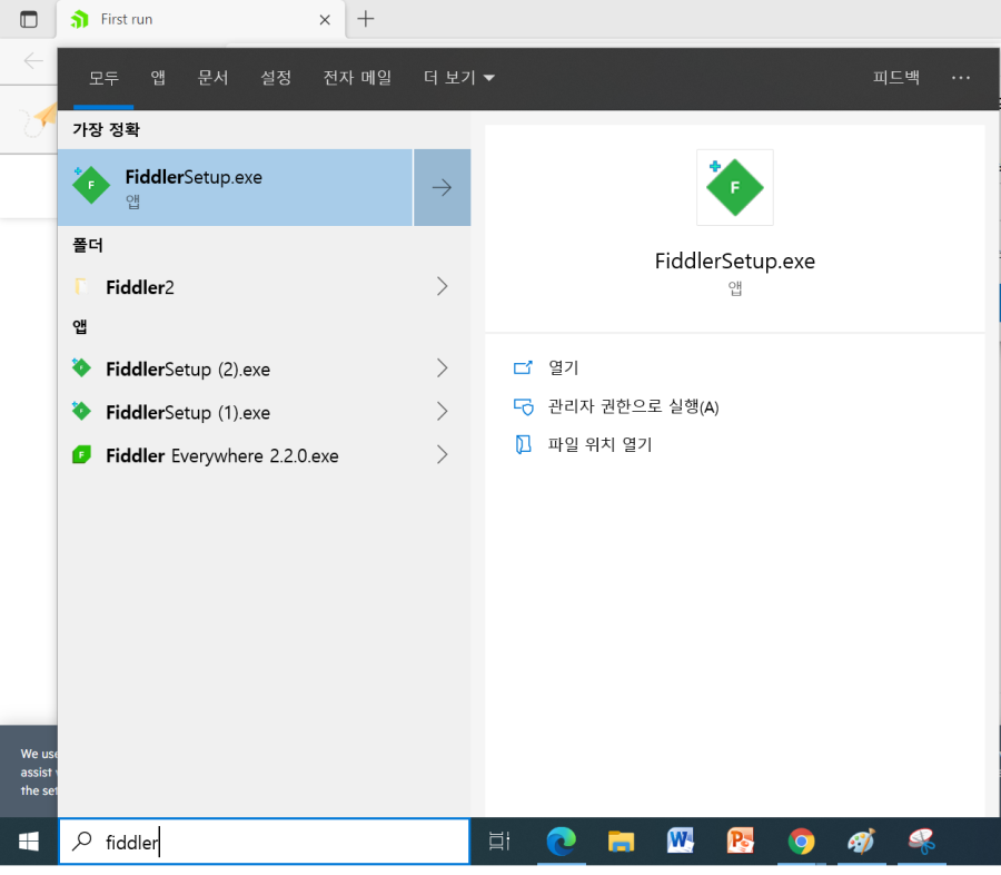 5) 윈도키를 눌러 fiddler를 입력하면 fiddler4가 설치되어 있습니다!
