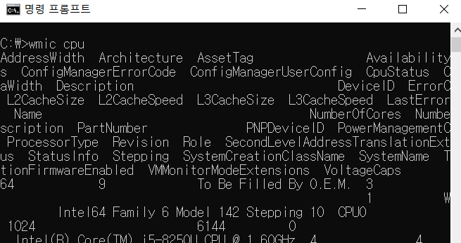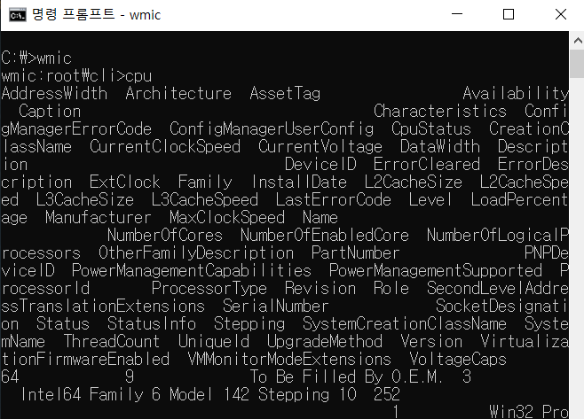 4. 커맨드창에서 곧바로 WMIC CPU 라고 타이핑하여도 동일한 결과가 나오는것을 확인할 수 있습니다.